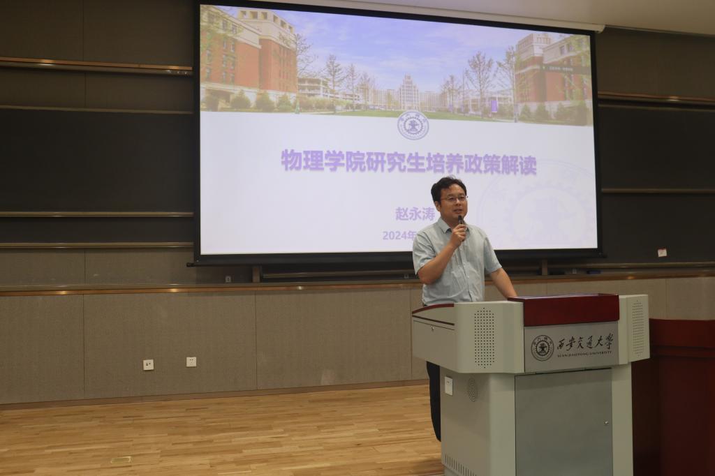 赵永涛副院长向同学们介绍了研究生培养方案,其中对研究生培养政策进行了全面解析,涵盖了研究生学籍管理、奖助学金、论文督导、培养计划以及“三助一辅”等方面,特别强调了研究生学位论文质量保障工作实施细则。他讲道‘凡事预则立,不预则废’,提醒同学们早做规划,提前了解知悉学校各项规定政策,为后续发展奠定基础。