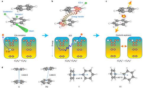 图1.a-c,电子束诱导苯二聚体分子间库仑衰变过程。入射电子与苯分子碰撞敲出其中一个内壳层C2s电子(a);该分子的退激发过程引发分子间库仑衰变使其发生二次电离并导致分子间键断裂(b);两个分子离子在库仑排斥作用下分离-库仑爆炸(c)。d,苯二聚体4种基本构型。[取自文献]