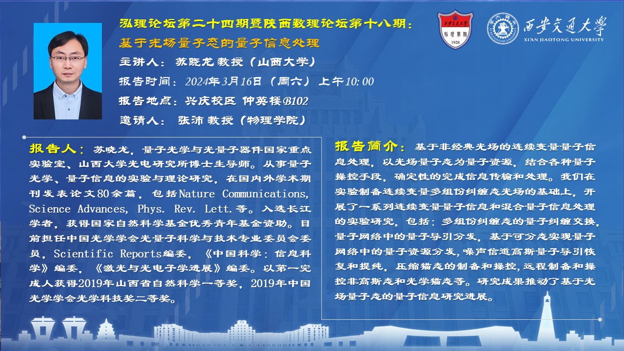 【泓理论坛第二十四期暨陕西数理论坛第十八期】——基于光场量子态的量子信息处理