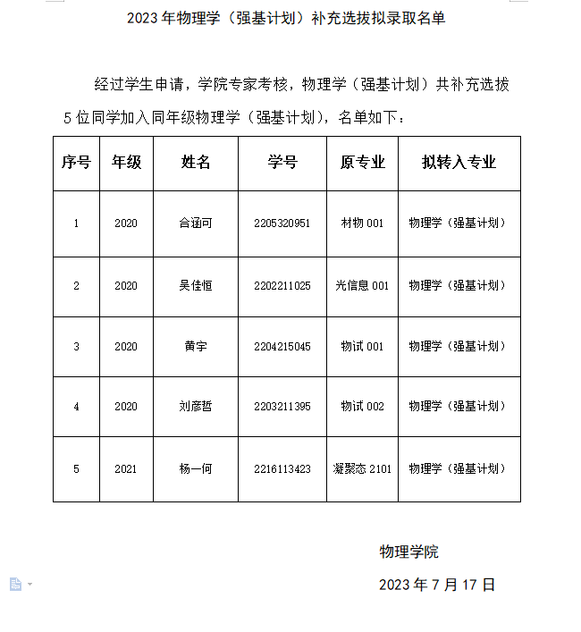 2023年物理学(国家拔尖计划)补充选拔笔试、面试安排