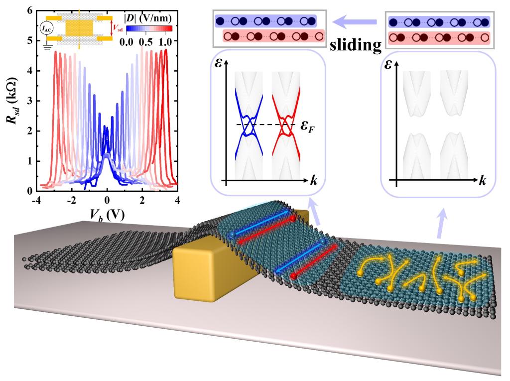 物质的电子结构由其微观结构决定,二维材料的层自由度则为操控其性质提供了一个新的维度。层间滑移作为决定二维材料微观结构的关键物理量,在调控电子结构及输运特性方面具有极大潜力。然而,如何在中心反演对称体系克服堆垛势垒以实现原子层滑移,并进一步实验验证层间滑移对电子输运性质的影响,是该领域面临的核心挑战。