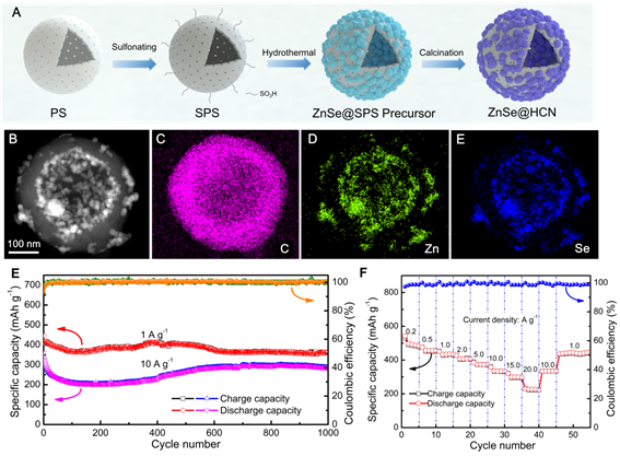 为论文第一通讯单位。该工作借助乙二胺对离子在介孔通道的辅助渗透作用将超细ZnSe纳米颗粒均匀生长在无定型空心碳纳米球的壳层内表面和外表面(ZnSe@HCNs),从而提升了电极材料的导电性和结构稳定性,增大了电活性ZnSe颗粒在表面和近表面的氧化还原反应能力,提高了比容量、长循环稳定性和高倍率性能,在1 A g-1和10 A g-1的电流密度下循环1000圈后,其可逆比容量分别为361.9和285.9 mAh g-1。进一步与磷酸钒钠正极组装成全电池后发现全电池的放电比容量达到313.1 mAh g-1。该研究成果为制备高性能电极材料提供了一种新策略。