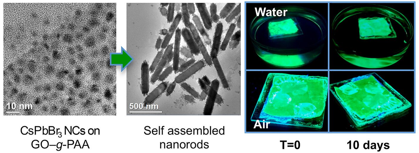 理学院和玲教授课题组以石墨烯表面接枝的聚合物为配体原位生长钙钛矿(CsPbX3,X=Cl,Br,I)量子点并有效对其进行了包裹,最终实现了该量子点的高稳定性制备。在该研究中,创新性地以石墨烯表面接枝的聚合物为量子点生长配体,原位生长钙钛矿(CsPbX3,X=Cl,Br,I)量子点,成功获得NC-GO-g-PAA。通过对石墨烯表面接枝的聚合物的有效调控,实现了石墨烯接枝聚合物有效的包裹量子点,得到微纳尺度的棒状杂化结构,系统评估了该结构包裹下量子点的稳定性。本工作将为制备得到高稳定性钙钛矿量子点提供了一种切实可行且有效的新方法,具有潜在的应用价值。