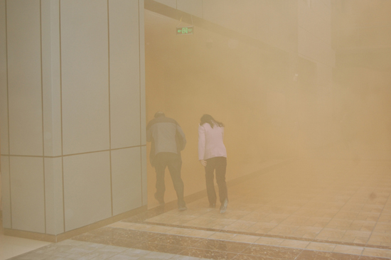 上午9点整,伴随着烟雾弹的燃放,新大楼内部浓烟滚滚。指挥中心内材料学院潘书记用广播喇叭下达命令:“全体师生注意,材料学院,理学院防火演练正式开始,现在全体师生迅速按疏散方案撤离!”火灾逃生演练正式开始。面对“突发”事件,物业负责人刘晓芹第一时间启动了本楼紧急警报,并将电梯迅速降至一层,打开所有应急疏散通道。伴随着新大楼响起的长笛警报声,全体师生按照大楼内的逃生路线,迅速、平稳、有序地进行,在经过充满烟雾的路线时,大家用湿毛巾捂住口鼻,采用低姿行走,整齐有序,疏散完毕后,各楼层负责人对本楼层进行检查,确定所有学生安全撤离,并清点人数,记录逃生时间。整个演习撤离后大约用时3分钟。