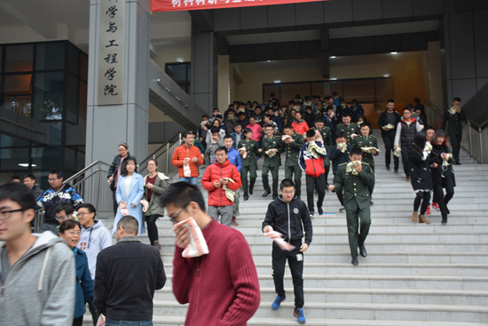 材料与基础学科大楼是今年新落成的教学科研大楼,该大楼是学校基础建设的重点工程。材料学院及理学院教职工接近300人,本科生及研究生近3000人在此办公,人员密集,流动性大。由于该楼新近建成没有形成有效的应急组织框架,师生对大楼的逃生通道尤为不熟悉。为了进一步加强新大楼的安全工作,增强学校师生消防安全意识提高教职工及学生对火灾的自救防范能力及应急扑救处置能力,做到在发生火警火灾时,能临危不乱,有序、迅速地按照消防逃生路线安全疏散,确保生命安全及学校学员的消防安全。材料学院、理学院及大楼物业,本着坚持“安全第一,预防为主”的方针和“以人为本”的思想,于2016年11月9号上午举办此次大型消防疏散演练活动。
