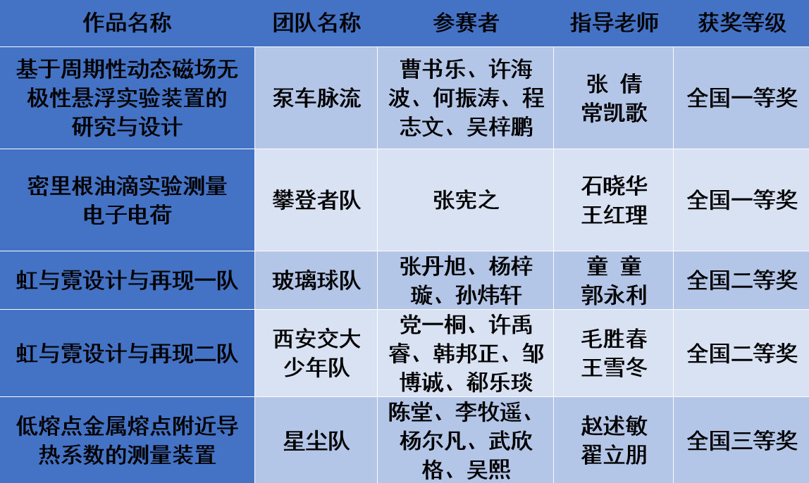 少年队“虹与霓设计与再现”双获全国二等奖;讲课赛道,攀登者队“密里根油滴法测电子电荷”获全国一等奖;自选赛道,星尘队“低熔点金属熔点附近导热系数的测量装置”获全国三等奖。最终取得我校在该赛事上获奖等级和类项的双突破,同时我校被大赛组委会评为“优秀组织单位”。