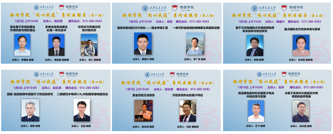 自2022年1月3日起,“同心战疫”系列云报告通过腾讯会议线上开展,至今为止已顺利举办了六期,聚焦了混合量子系统的耦合作用机制与调控理论、多维光信息成像及处理一体化技术、基于冷冻电镜的水环境微观物质体系结构与物性研究、高容量电极材料在锂离子电池中的应用与发展等主题,为大家带来了最新的学术前沿进展和相关科研方法的实践应用创新报告。同时,学院也邀请了近年来获批过国家自然科学基金项目的教师分享基金申请经验和技巧,极大满足了正在闭关修炼、准备申报材料的教师的需求。