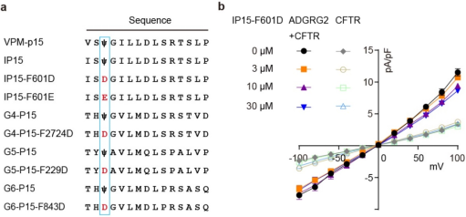 目前关于aGPCR家族的拮抗剂报道甚少,制约着aGPCR家族功能的研究和相关靶向药物的开发。利用新开发的激动剂VPM-IP15,在W6.53附近的三个“手指”残基做了一系列突变,在生化验证中发现IP15中Fss03替换为D/E的负电改造可以消除ADGRG2的Gs活性,同时又与受体保持着高亲和力,并且这两个衍生肽可显著抑制ADGRG2的激活活力,同时也能抑制ADGRG2介导的CFTR钙流响应。这种通过多肽激动剂进行负电改造获得多肽拮抗剂的策略,如同在激活的手指模型的大拇指上戴了个戒指,决定性地改变了粘附类受体多肽的功能,且此方法在ADGRG4、ADGRG5和ADGRG6中也同样适用。本研究针对Fss03进行极性改造,开发了一种aGPCR家族拮抗性短肽配体的通用改造方法,将极大推动aGPCR家族多肽拮抗剂的发展。