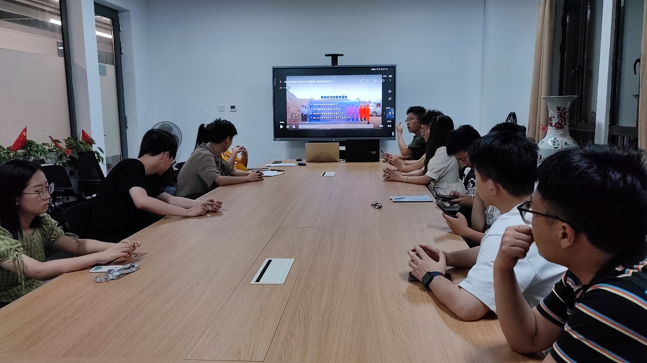 硕2021级党支部召开安全生产专题组织生活会。支部书记徐文龙同志带领大家学习领会安全生产月的重要意义和政策文件精神;组织委员王浩鑫同志带领观看“2022年全国‘安全生产月’典型重大事故警示教育片”,引导大家展开广泛而深刻的讨论;纪律委员刘嘉乐同志组织开展实验室安全知识答题活动,巩固安全知识,树立安全意识;会后大家一起走进实验室,认真阅读实验室规章制度,提升安全防范意识,熟悉应急工具的使用方式。