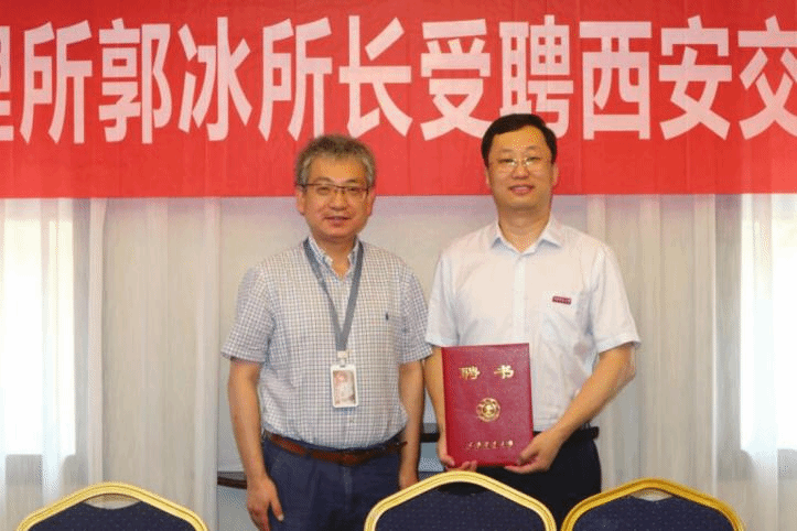 兼职教授聘书,并为郭冰佩戴校徽。