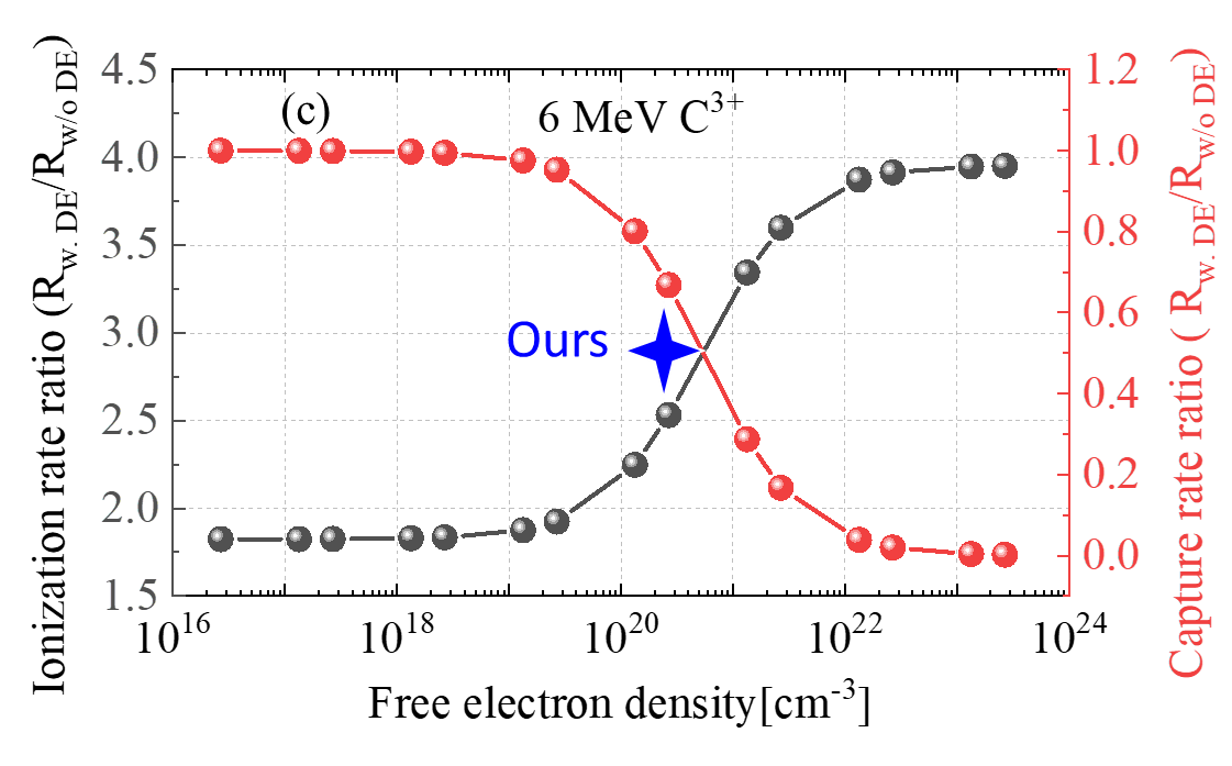 赵永涛教授团队联合中国工程物理研究院激光聚变研究中心、深圳技术大学、中国科学院近代物理研究所等单位,依托“星光III”强激光大科学装置,突破准静态稠密等离子体制备和诊断难题,充分利用激光加速离子束的短脉冲和宽能谱优势,获取了束靶参数明确的MeV量级宽能谱碳离子在稠密等离子体中的电荷演化高精度实验数据,首次在实验上证明了等离子体中靶密度效应对离子电荷交换过程的影响机制。该工作对激光加速离子束在聚变能源、放射医疗以及离子束剥离技术等领域的应用具有广泛的影响。