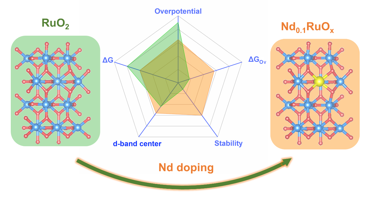 杨生春教授和王斌副教授基于d带中心理论,设计了能够在酸性电解液中稳定工作的Nd掺杂RuO2(Nd0.1RuOx)析氧催化剂,其在10 mA cm−2电流密度下的过电势仅为211 mV,并表现出优异的耐久性。理论计算表明,Nd的引入能够调控Nd0.1RuOx的d带中心能量,有效平衡了含氧中间体的吸附和解吸,降低了反应决速步(O*àOOH*)的能垒,从而加速了Nd0.1RuOx的析氧反应过程。此外,Nd掺杂还使得Nd0.1RuOx的O 2p能带中心下移,表明Nd0.1RuOx中Ru-O的共价性减弱,使其在热力学上不利于发生直接O-O耦合基元反应步骤。同时,Nd0.1RuOx中高比例的Ru4+有效抑制了析氧过程中Ru在酸性电解质中的溶解。将Nd0.1RuOx/CC作为析氧阳极组装于PEM电解槽中后可以在10 mA cm−2下稳定运行50 h,展示出优异的稳定性。该研究通过设计RuO2的电子结构,为酸性电解质中OER催化剂的设计提供了新思路。上述研究工作近日以(Optimizing the Electronic Structure of Ruthenium Oxide by Neodymium Doping for Enhanced Acidic Oxygen Evolution Catalysis)为题发表在国际知名期刊Advanced Functional Materials。论文第一作者为91论坛