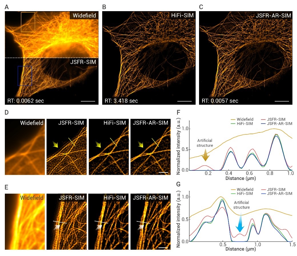 图1:HeLa细胞中的细胞骨架成像结果对比。JSFR-AR-SIM相比其他算法,重建时间(RT)更短,重构伪影也得到了抑制。