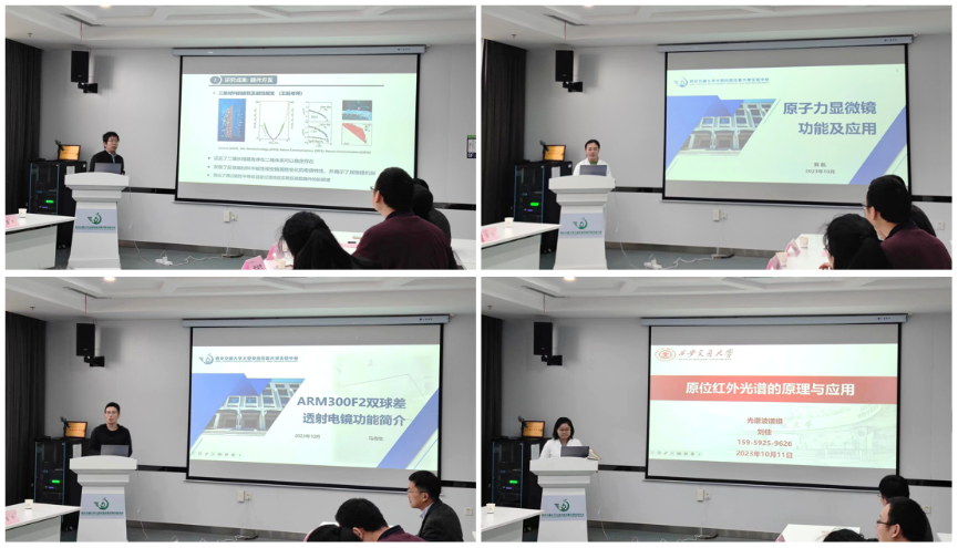 潘杰副教授介绍了关于二维量子材料与器件的研究成果与表征需求,提出了当前仪器使用中对于定位功能、协助扩展测量功能等方面面临的技术难题。中心工程师郭航、马传生、刘佳分别作了《原子力显微镜功能及应用》、《ARM300F2双球差透射电镜功能简介》及《原位红外光谱的原理与应用》的报告,深入浅出的讲解和详实案例展示,使与会教师对中心仪器有了更全面的认识。