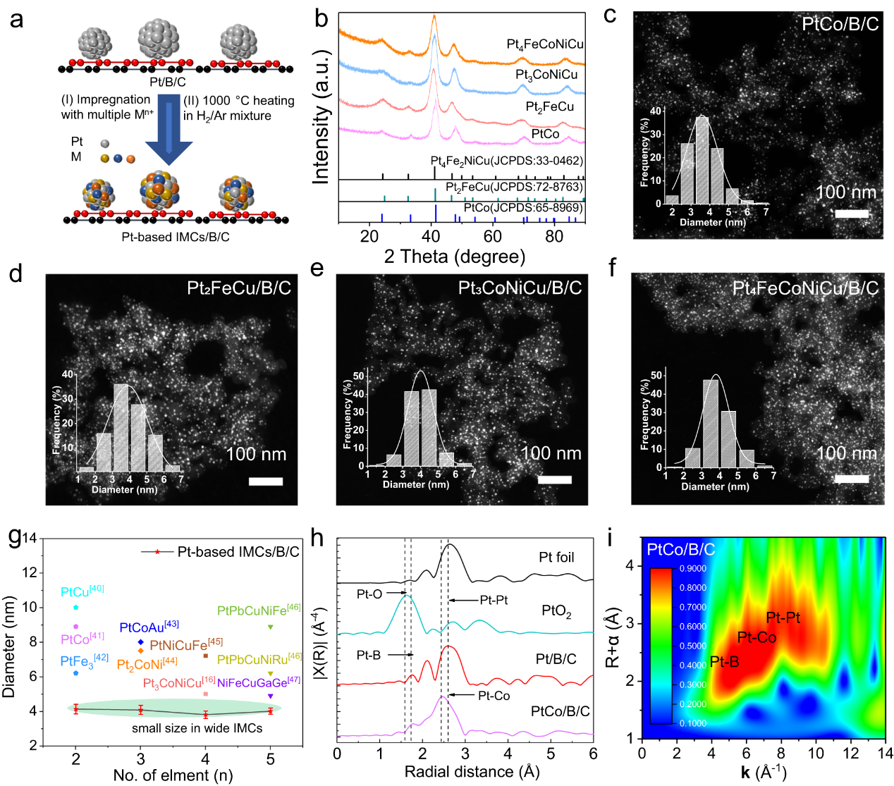 针对上述关键问题,杨生春教授团队在前期研究基础上(ACS Appl Mater & Interfaces, 2022;J Mater Chem A, 2020)提出了一种利用氢化烯(HB)合成多组元Pt金属间化合物(IMCs)的新方法。该方法将HB的还原性与原位形成的硼(B)纳米片相结合,形成了强金属-载体相互作用(SMSI),从而使催化剂具有更小的尺寸、更高的负载能力和稳定性。实验和理论计算揭示了催化剂中Pt-B键对催化剂的稳定性起到了关键作用,可使Pt纳米颗粒能够在高密度分布条件下仍然保持高度分散,即使在800-1000℃高温热处理过程中也展现出优异的抗烧结性能。此外,该策略还适用于在纳米碳(如碳黑、碳纳米管、石墨烯)和金属氧化物(如Al2O3、TiO2、CeO2)材料表面制备超小尺寸和高负载量的负载型贵金属催化剂,从而极大地拓展了该策略的适用范围。通过Pt-B之间的SMSI效应,团队成功合成了一系列超小尺寸的二元、三元、四元和五元Pt基多组元金属间化合物燃料电池催化剂。与商业催化剂相比,这些i-PtM催化剂表现出更高的催化活性和耐久性。