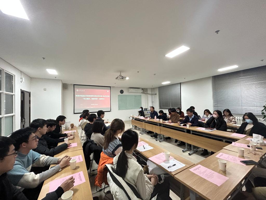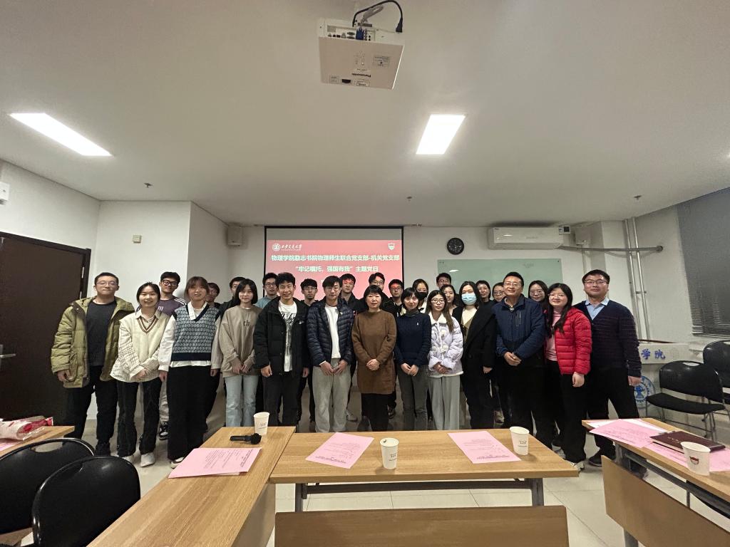 主题学习环节,物理师生联合党支部党员席超博从建国初期、改革与发展时期以及十八大以来的教育讲起,领学习近平总书记在二十届中央政治局第五次集体学习时的重要讲话精神,深刻阐述了扎实推动教育强国建设的内涵;魏小平、代旺和武婧分别领学分享了《习近平致全国优秀教师代表的信》、习近平总书记来陕来校考察重要讲话精神和《中共91论坛