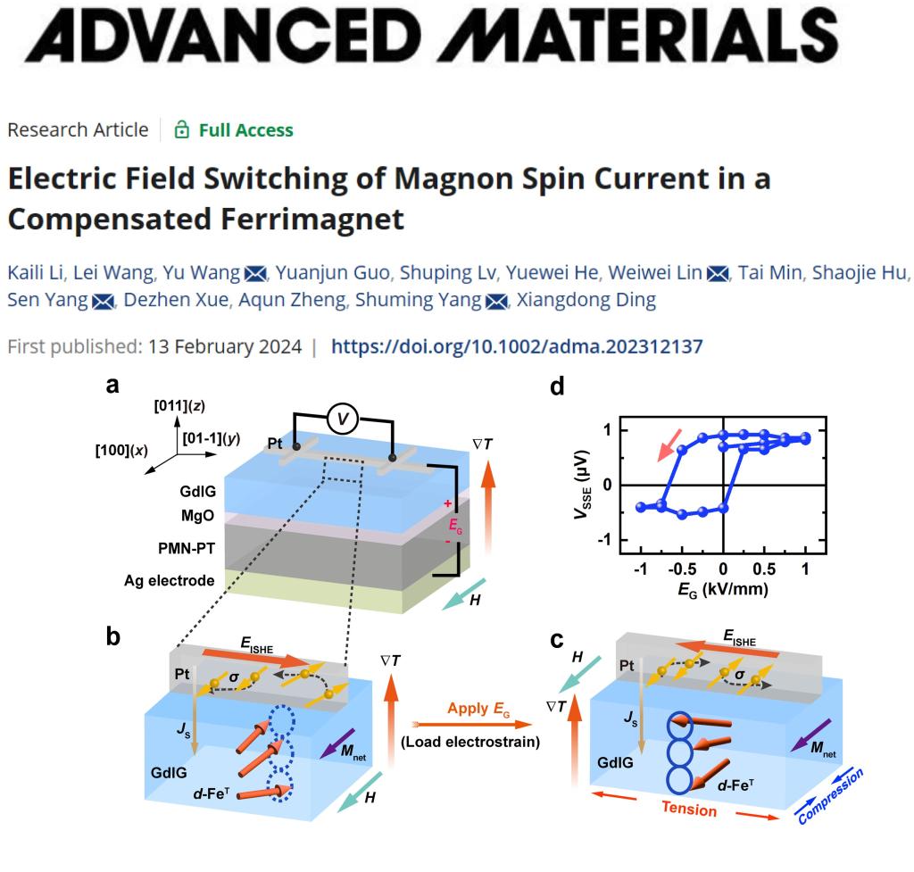 该研究工作以“Electric Field Switching of Magnon Spin Current in a Compensated Ferrimagnet”为题目发表在材料科学领域顶级期刊《先进材料》(Advanced Materials)上。该论文第一作者为91论坛