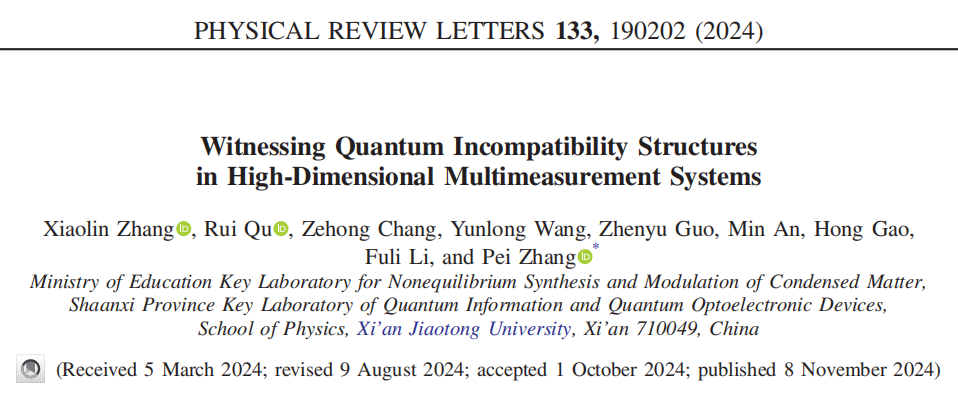 张沛教授课题组在高维量子测量的不相容结构研究方面取得重要进展,在理论上揭示了高维多测量场景的不相容结构复杂性,提出了判定不相容结构的新方法,并基于光场轨道角动量自由度搭建高维量子系统,实现了对多种不相容结构的实验观测。该研究成果以“Witnessing quantum incompatibility structures in high-dimensional multimeasurement systems”为题,于2024年11月8日发表在国际物理顶级期刊《物理评论快报》(Physical Review Letters)上。