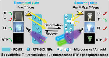 由单分散磷光SiO2纳米球制备的多光学形态弹性体的形变诱导光学信号切换特性示意图。