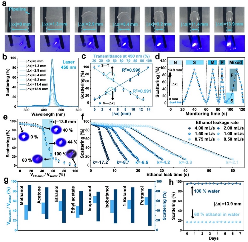 基于上述特性,MOME独特的机械形变响应光学行为在水下机械力(水压、水流、水冲击等)传感领域展现出显著优势。通过协同利用MOME的光散射调制特性及其形变依赖的FL/RTP发光特性,研究人员系统探索了该材料作为光学传感装置在水下管道位移偏差、泄漏检测、泄漏速率评估、管道膨胀及局部异常凸起等工况的实时可视化感知与监测应用。该研究成果为多模式光学集成器件的设计提供了突破性解决方案。具有多信号输出的响应型光学器件的成功构建,为实现器件光学信号与响应效率的多维度调控提供了机会,展现出广阔的应用前景。