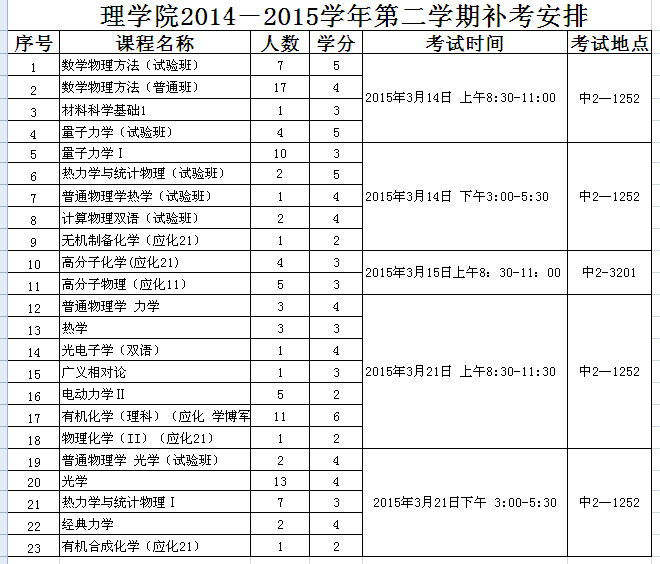 理学院2014-2015学年第二学期本科专业补考安排