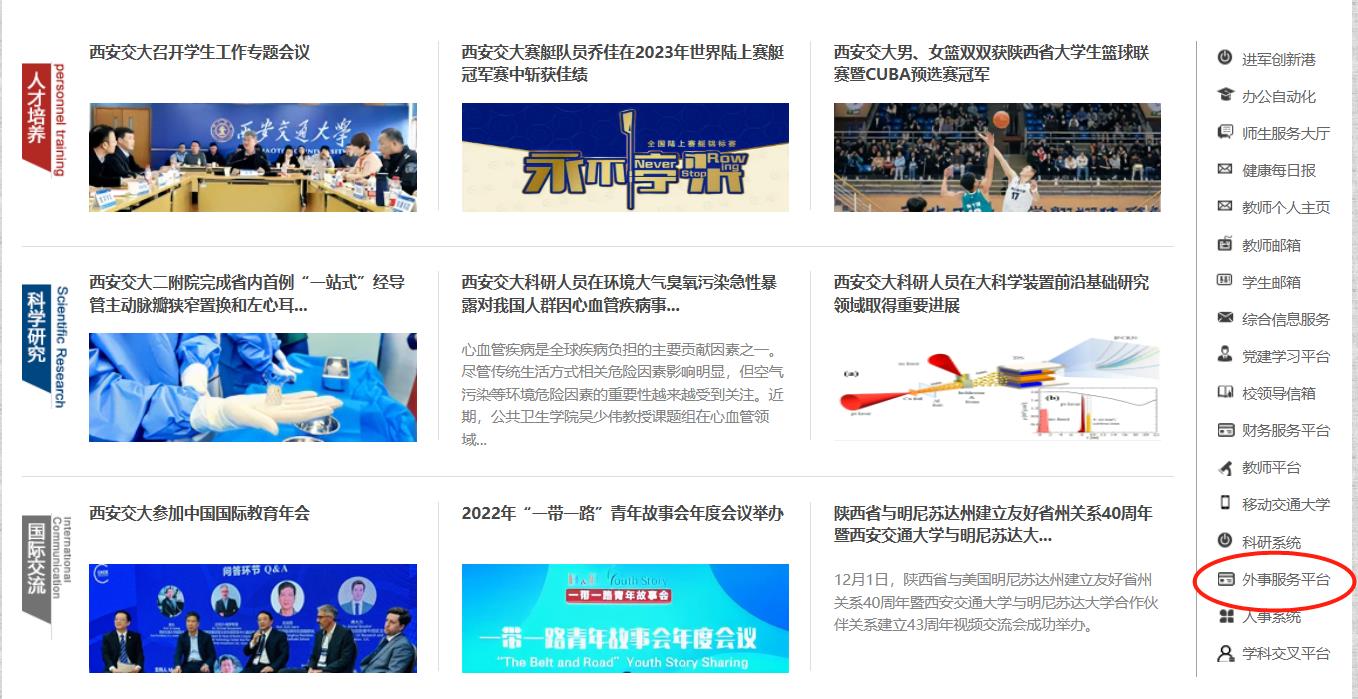 外事服务平台由学校主页右下方进入,校外需先登录VPN。