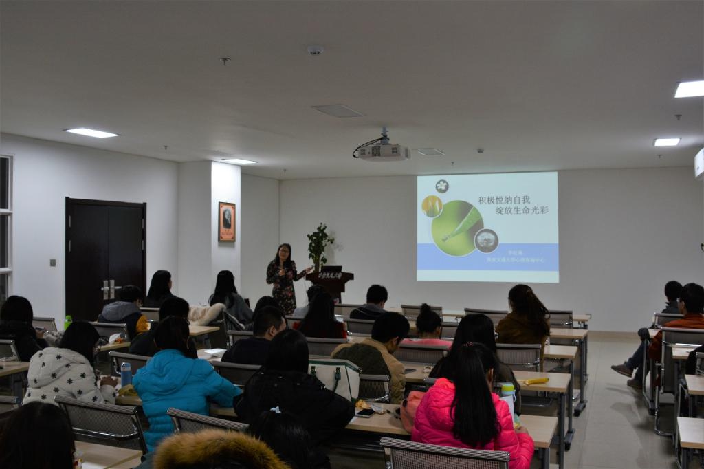 最后,心理咨询中心李红燕老师做了题为“积极悦纳自我,绽放生命光彩”心理健康讲座。李老师通过引用经典语录的方式提出了“你是谁”“你和你的世界”这两个问题,并且通过图片、视频、游戏互动等方式让同学们更好的了解自我、接受自我、欣赏自我、感谢自我。“每个人都是生命能量独一无二的呈现,每个人都是生命的协同创造者”李老师如是说。