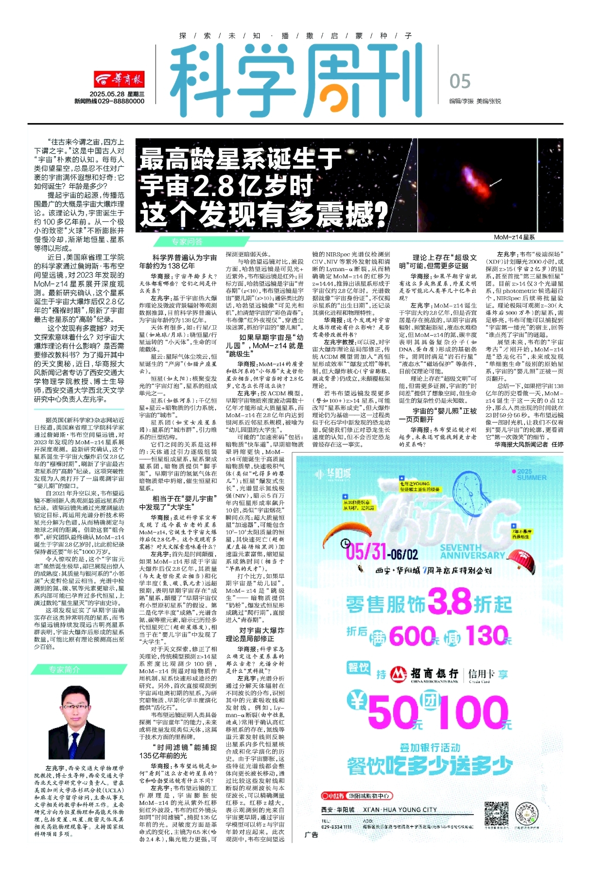 华商报:如果早期宇宙就有这么多成熟星系,外星文明是否可能比人类早几十亿年出现? 左兆宇:MoM-z14诞生于宇宙大约2.8亿年,但是否宜居是存在挑战的,早期宇宙高辐射、频繁超新星,液态水难稳定,但MoM-z14的氮、碳丰度表明其具备复杂分子(如DNA、蛋白质)形成的基础条件。需同时满足“岩石行星”“液态水”“磁场保护”等条件,目前仅理论可能。